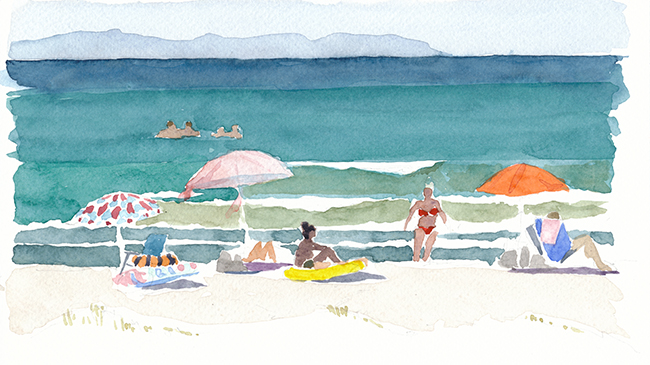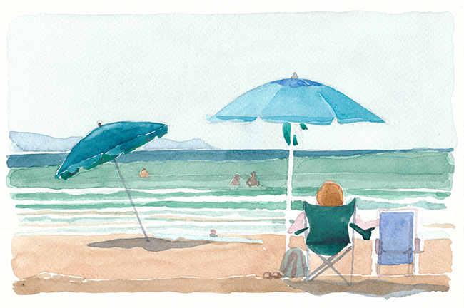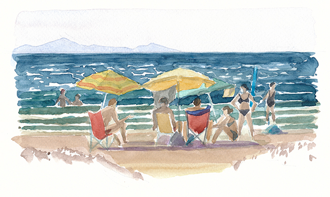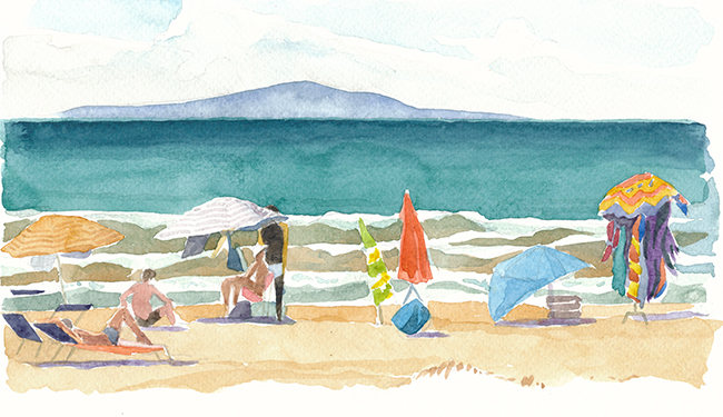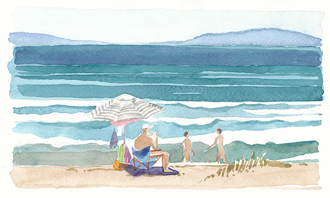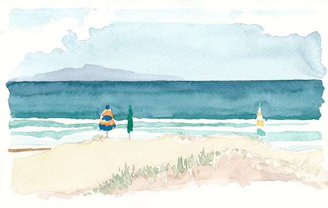 Ein schmaler Streifen Sand trennt mich vom türkisblauen Meer. Der Wind bewegt die Kronen der Pinien, bringt das dürre Gras zum zittern. Vor der weissen Gischt flattern die Ränder der Sonnenschirme. Schief und zerzaust bilden sie kleine Schattenkreise. Schlanke Gestalten in langen, bunt gemusterten Gewändern schreiten dem Ufer entlang. Sie nicken den Bewohnern der Schattenkreise zu und gehen weiter, gemessenen Schrittes, gebeugt von ihren Lasten. Ein Tisch steht nahe am Wasser und präsentiert eine dicht geordnete Auslage geflochtener Körbe in allen Farben und Formen. Taschen und Kleider hängen an drei alten Strandschirmen. Durch die Gewichte verändert, erinnern sie an die farbigen Quallen, die ich beim Tauchen weiter draussen mit einer Mischung aus Schauder und Neugierde beobachte. Am späten Nachmittag, wenn die Sonne die Farben des Wassers in blendendes Silber verwandelt, strömen die Menschen vom grossen Badestrand herbei und betrachten die exotischen Dinge, die Caré aus Senegal hier ausgebreitet hat. Am Horizont, vom Dunst verschleiert, liegt Elba. Ich tauche den Pinsel ins Wasser und beginne in der Ferne mit einem Streifen Indigo. Dann tauche ich mit den Augen ins näher liegende Blaugrün, lasse schmale weisse Bänder für den Schaum der Wogen stehen und betrachte die leuchtenden Kontraste der Schirme, der Sessel und Gummiboote. Ein small talk mit dem fröhlichen Caré und schliesslich wate ich hinaus in meine Farben hinein, über Sandbänke und Seegras bis zur Stelle, wo die Wellen am höchsten sind. Hier tauche ich ab und schwimme hinaus bis sich der Grund in dunkler Tiefe verliert.