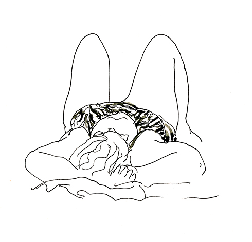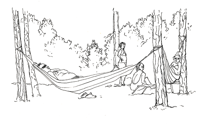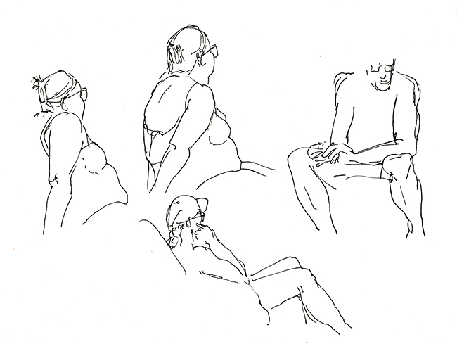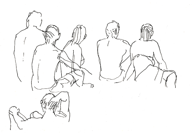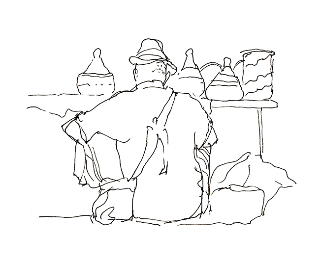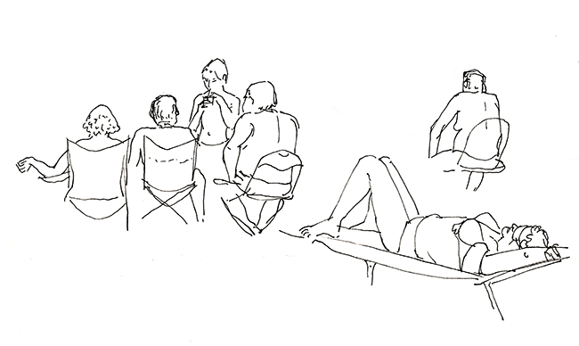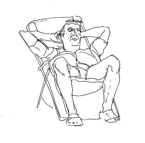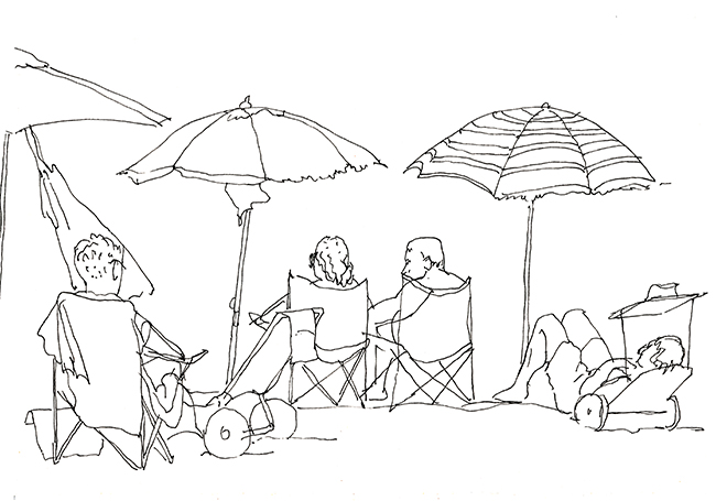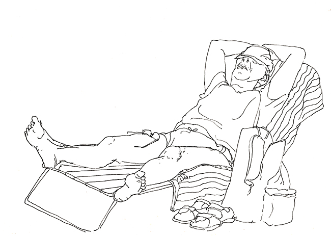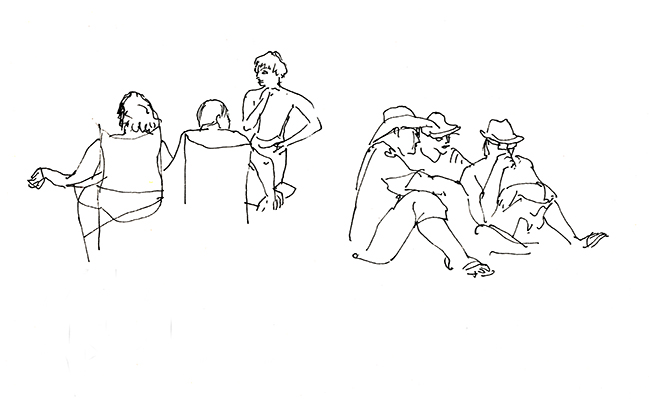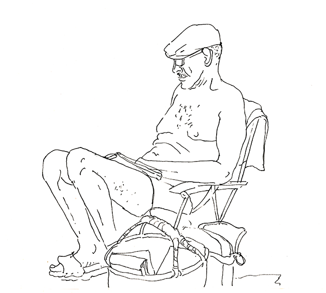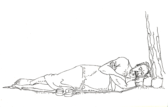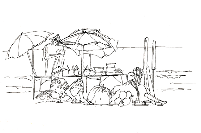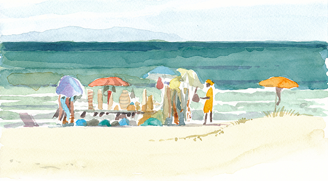 Im Wald der Träumenden, umgeben von Schlafenden. Über mir das Geflecht zerzauster Pinien, um mich herum erschöpfte Afrikaner, ihrer Lasten entledigt. Die Körbe und Taschen, die Tücher und Schirme, ihre bunten Spielereien liegen wie ermattete Tiere am Boden verstreut. Afrika im Schlaf. Die Marktstände am Strand sind fast ganz verschwunden, die wunderlich behängten Schirme, die überquellenden Kleiderständer den Sonnenschirmen der wenigen Badenden gewichen. Ohnehin hat die gestrige Razzia die öffentliche Ordnung wieder hergestellt, alle die Mustafa und Mohamed heissen an ihre Pflicht erinnert zu wandern. Wenn es nach der Polizia urbani ginge, am besten zurück woher sie kamen. Am Himmel brummt ein Flugzeug, das Meer atmet kaum und langsam verdüstert sich der Horizont. Aus Süden nähern sich Wolken, wie Schwefel leuchtet der Strand vor dem smaragdgrünen Wasser. Mit den ersten Regentropfen verabschiede ich mich von meinem Freiluftatelier.