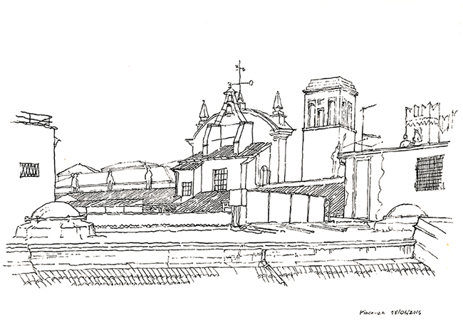 Piacenza, Blick über die Dächer zur Basilica San Francesco, 18. Juni 2016
