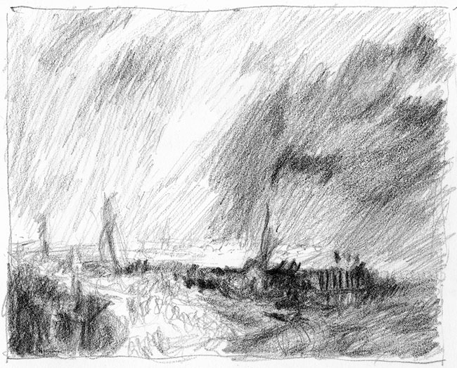 In Turners aufwühlender Geste drückt sich der dramatische Moment eines beklemmenden Naturschauspiels aus. Das Licht des Himmels, ausgegossen über die aufgerissenen Wolken, die schäumenden Wellen mit ihrer stiebenden Gischt, scheint zu explodieren. Und gleichzeitig sind die losen Bildelemente in eine strenge Komposition eingefügt durch ihre Farbe, der sich alles unterwirft. Ihre schneidende, weisse Helligkeit wird zu reinem Licht und bleibt dennoch an die Materialität der Farbe gebunden. Die stete Verwandlung von Materie zu Licht, die dem Auge des Betrachters abgefordert wird, machen Turners Bilder so unglaublich lebendig. Dünne Lasuren über der satt gespachtelten Farbe lassen das Ringen um einen differenzierten Ausdruck erahnen. Turners Malweise veranschaulicht die Suche nach einem Gleichgewicht zwischen Spontaneität, Heftigkeit und Selbstkontrolle.