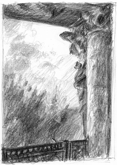 Menzels Aussicht vom Balkon wird von der rückseitigen Ansicht an ein Stück schweres Fassadendekor begrenzt. Der Blick streift an einer Säule vorbei in die unbestimmte Tiefe des von Wolken getrübten Himmels. Die Aussicht schliesst die steinernen Zierelemente mit ein, ohne Preis zu geben, was der Fassadenschmuck von vorne darstellen könnte. Mit der Aussicht durch das rahmende Innere auf den davor liegenden Aussenraum, schildert die kleinformatige Ölskizze unspektakuläre Wirklichkeit und die ihr innewohnende Schönheit. Eine Ästhetik, die sich nur jenen erschliesst, welche die Stille des Alltäglichen beobachtend durchdringen. Ein kleiner Vogel sitzt auf dem eisernen Balkongeländer. Hart und messerscharf trennt der Vordergrund die Sicht auf die weitere Umgebung ab. Schon vor Degas ist Menzel hinsichtlich Bildausschnitt und Komposition von überraschender Modernität.
