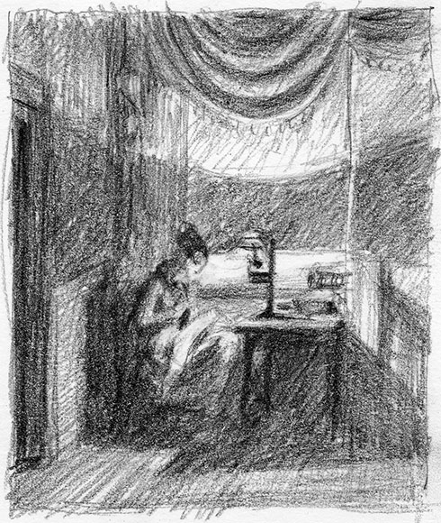 Eines der schönsten Interieurbilder von Kersting! Es zeigt eine weibliche Person in Verbindung mit dem warmen Licht einer eleganten Argand-Lampe in einem geschlossenen Innenraum. Wie kaum ein anderer Maler seiner Zeit verbindet Kersting Licht und zugehörige Schatten in ausgeglichenen Kompositionen zu bildübergreifenden Formen. Im Zentrum steht ein Mensch im Zwiegespräch mit seinen Gedanken. Dem inneren Dialog ist seine Verbundenheit mit dem Licht gegenübergestellt. Die Abgeschlossenheit des Raums mit den umhüllenden Formen von Licht und Schatten vermittelt den Eindruck von Schutz und häuslicher Geborgenheit. Unter dem Schein der Lampe ist die junge Frau ihrer kontemplativen Beschäftigung hingegeben. Zugleich entfalten die bizarren Formgestalten, die sich als Schatten im Zimmer über Mobiliar, Wände und Fussboden ausbreiten ein beunruhigendes Eigenleben. Sie künden von der Wahrnehmung einer äusseren Welt in Unruhe – vor der dieser geschlossene Raum zwar schützt – die sich jedoch in ihrer Bedrohlichkeit weder aussperren noch ganz verdrängen lässt.