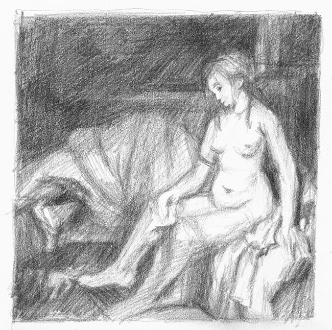 Bathseba bleibt mit ihrem Wissen allein. Diskret ist die Schriftseite der Nachricht nach unten gewendet, dem Blick der alten Dienerin entzogen. Deren Gestalt versinkt im Schatten; als Bezugsperson ist sie ohne Gewicht und darauf beschränkt die Füsse ihrer Herrin zu trocknen. Im Wesentlichen verstehen wir Bathseba als Einzelfigur, auch wenn Rembrandt das Motiv der Lebensalter ins Spiel bringt, den Menschen in der Zeit, in seiner Vergänglichkeit andeutet und ein Merkmal des Übergangs schafft. Was Rembrandt jedoch hervorhebt ist der versonnene Zug des ins Profil gewendeten Gesichts; die Nachdenklichkeit mit der die junge Frau sich zur Dienerin wendet und dabei nach Innen blickt. Ihr Verhalten ruft unsere Teilnahme hervor und wir ahnen hinter Bathsebas Schicksals-ergebenheit ihre Einsamkeit und Trauer.