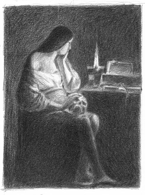 Die Dualität von Licht und Schatten bestimmt die klare Anordnung der Bildteile. Die hohe Flamme schneidet in das Dunkel des Raums und ihrem Licht antworten alle Reflexe, gefiltert durch Farbe und Stofflichkeit. Die Beleuchtung ordnet, klärt den Bildsinn, hebt hervor und vereinfacht. Alle Dinge, die im Umkreis des Lichts stehen, tragen auch eine symbolische Bedeutung: Die Bücher und die Öllampe stehen für die Erkenntnis des Glaubens, das Kreuz für den Opfertod Christi, die Geissel weist auf Sünde und deren Sühne, der Schädel auf die Vergänglichkeit. Magdalena richtet sich nach dem Licht und dem Glauben. Ihre Hand ergreift das Memento mori und damit die Gewissheit über das Vergängliche des irdischen Daseins.