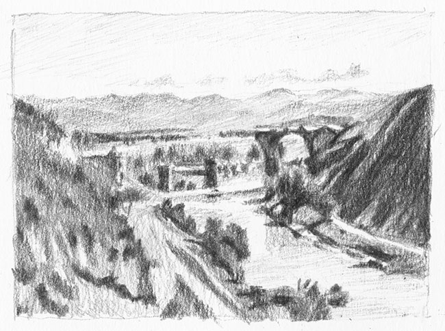Die Studie ist direkt vor dem Motiv entstanden und gibt Aufschluss über Corots Maltechnik und den malerischen Prozess während der Aufzeichnung seiner Beobachtungen. Bei meinem eigenen zeichnerischen Nachvollzug wird deutlich, wie streng Corot das Wahrgenommene ordnet, wie sein Auge Bezüge sucht und die Dinge vereinfacht, um der Bildanlage Festigkeit und Überschaubarkeit zu geben. Er fasst die Gegenstände der Landschaft unkörperlich als farbige Flecken auf und verbindet diese zu rhythmischen Folgen, denen das Auge entlang streift. Mit kräftigem Helldunkel und frischer Farbigkeit schildert er die Lichtstimmung und legt die Formen der Schatten fest. Im träge dahinfliessenden, braunen Strom der Nera spiegelt sich ein zartblauer Himmel und tritt im Schatten der Augustusbrücke als leuchtender Akzent hervor. Die Pinselspur belegt die Geschwindigkeit und Unmittelbarkeit der Studie.