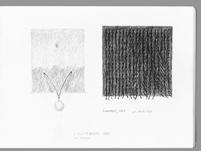 links: "C-Clamp-Blues", 1965, 83cm x 55cm, Metallkugel, Draht, Masonit